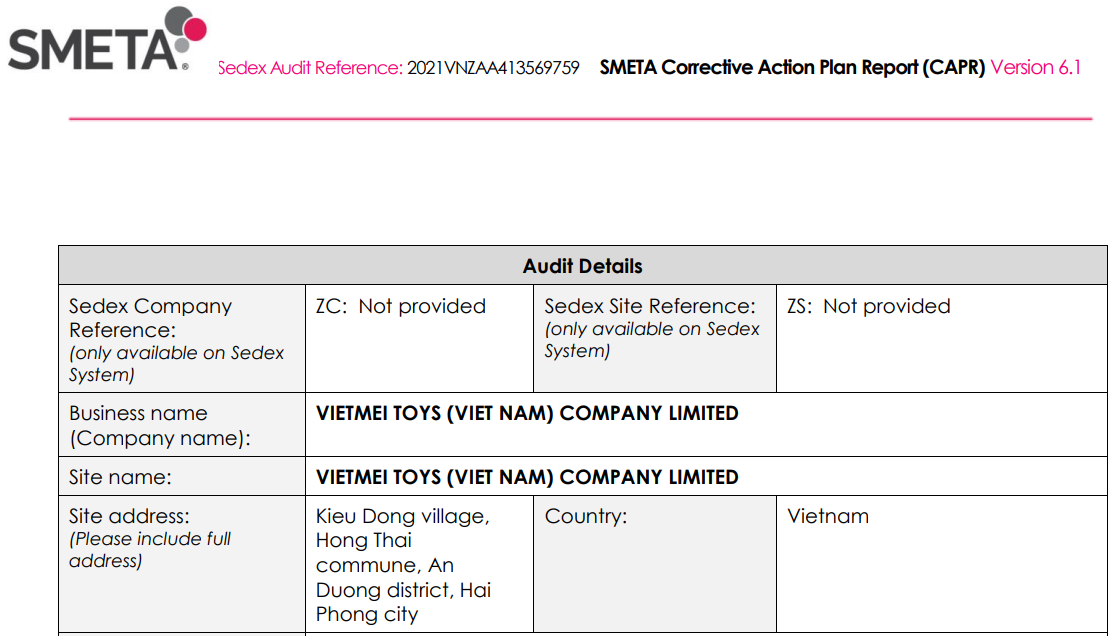 越美玩具(越南)有限公司【VIETMEI TOYS (VIET NAM) COMPANY LIMITED】在創(chuàng)思維技術(shù)服務(wù)(越南)有限公司輔導(dǎo)中2021順利通過ITS突擊審核的Sedex 4P驗廠,創(chuàng)思維2020年還幫助貴司順利通過ICTI驗廠。