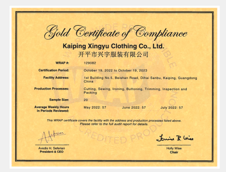 在創(chuàng)思維驗(yàn)廠網(wǎng)老師專業(yè)技術(shù)、全程跟進(jìn)耐心細(xì)致輔導(dǎo)以及公司全體員工配合下,一次性順利通過(guò)WRAP認(rèn)證,為將來(lái)公司發(fā)展奠定了良好的發(fā)展基礎(chǔ),既開(kāi)拓了市場(chǎng)同時(shí)也增加了消費(fèi)者對(duì)公司的信賴,在這里再次祝賀開(kāi)平市興宇服裝有限公司2022年一次性成功通過(guò)WRAP認(rèn)證,同時(shí)也期待未來(lái)再次與創(chuàng)思維驗(yàn)廠網(wǎng)合作!